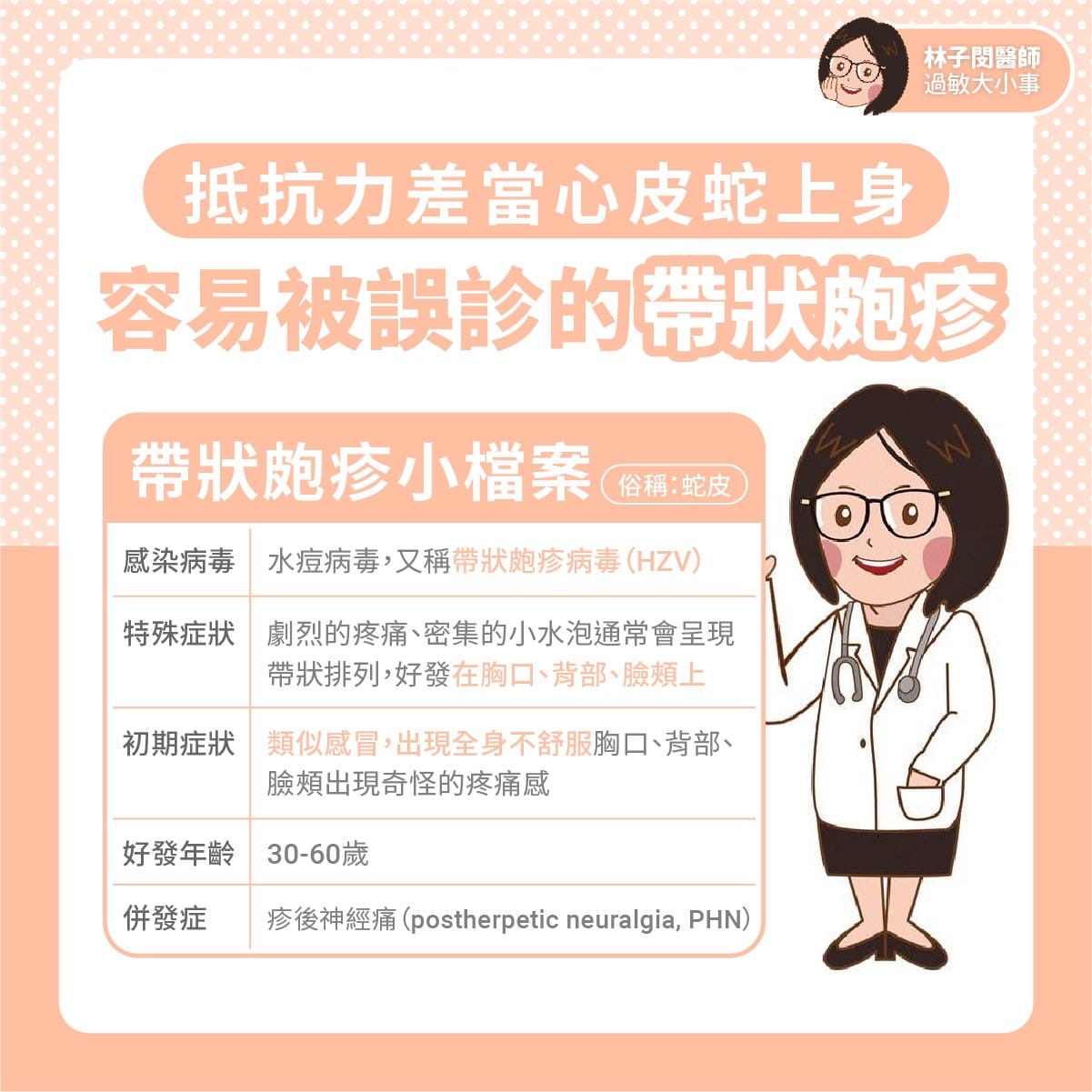 #帶狀疱疹 又俗稱 #皮蛇,是一種因為水痘帶狀疱疹病毒 (Varicella zoster virus) 感染造成疼痛紅疹的疾病。此病毒初次感染人體時,會造成「水痘」形式的表現。之後此病毒便潛伏在人體的神經節裡。當人體免疫力減弱時,病毒就會活化並沿著單側神經皮節產生疼痛紅疹,即「帶狀疱疹」。