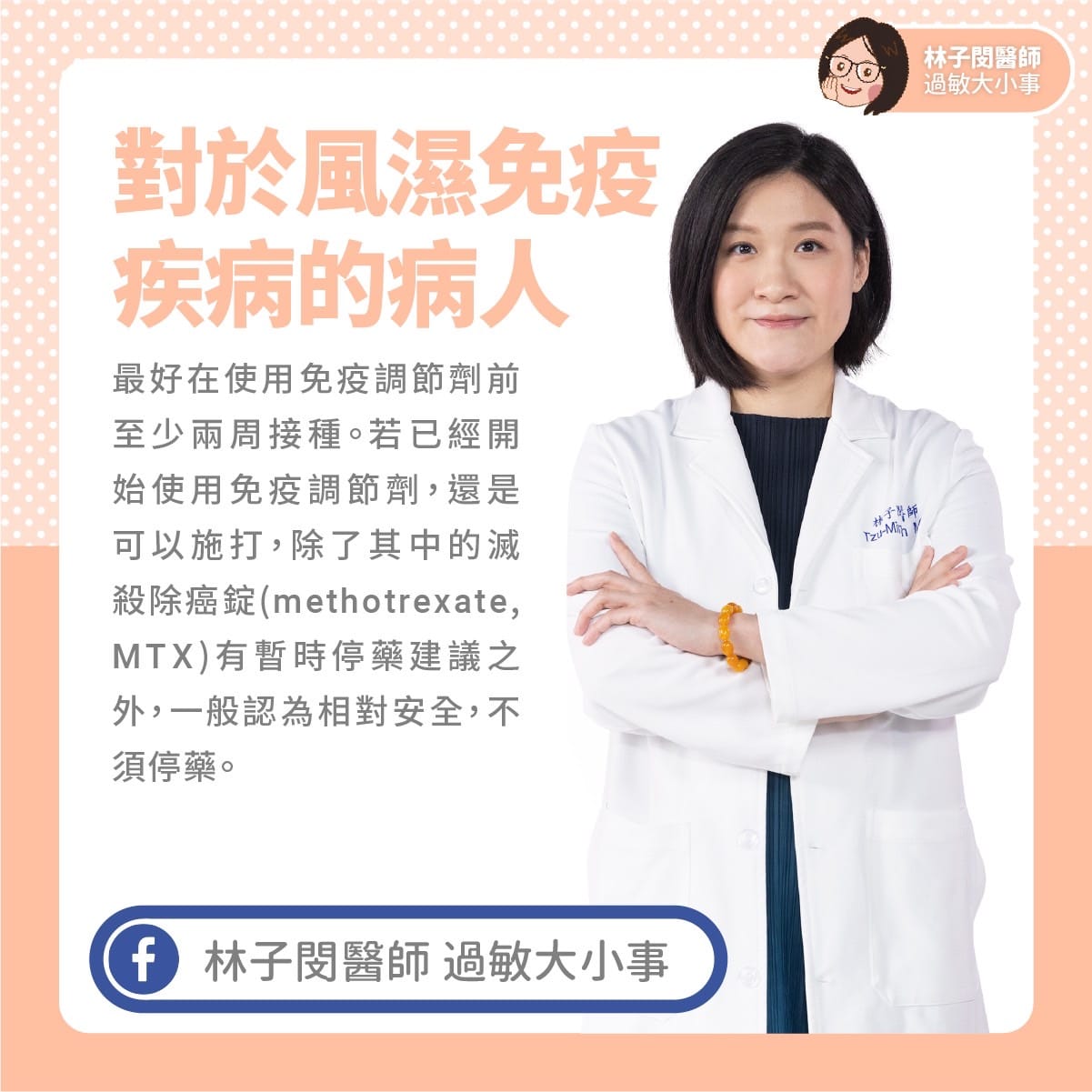 註:對於風濕免疫疾病的病人,最好在使用免疫調節劑前至少兩周接種。若已經開始使用免疫調節劑,還是可以施打,除了其中的滅殺除癌錠(methotrexate, MTX)有暫時停藥建議之外,一般認為相對安全,不須停藥。