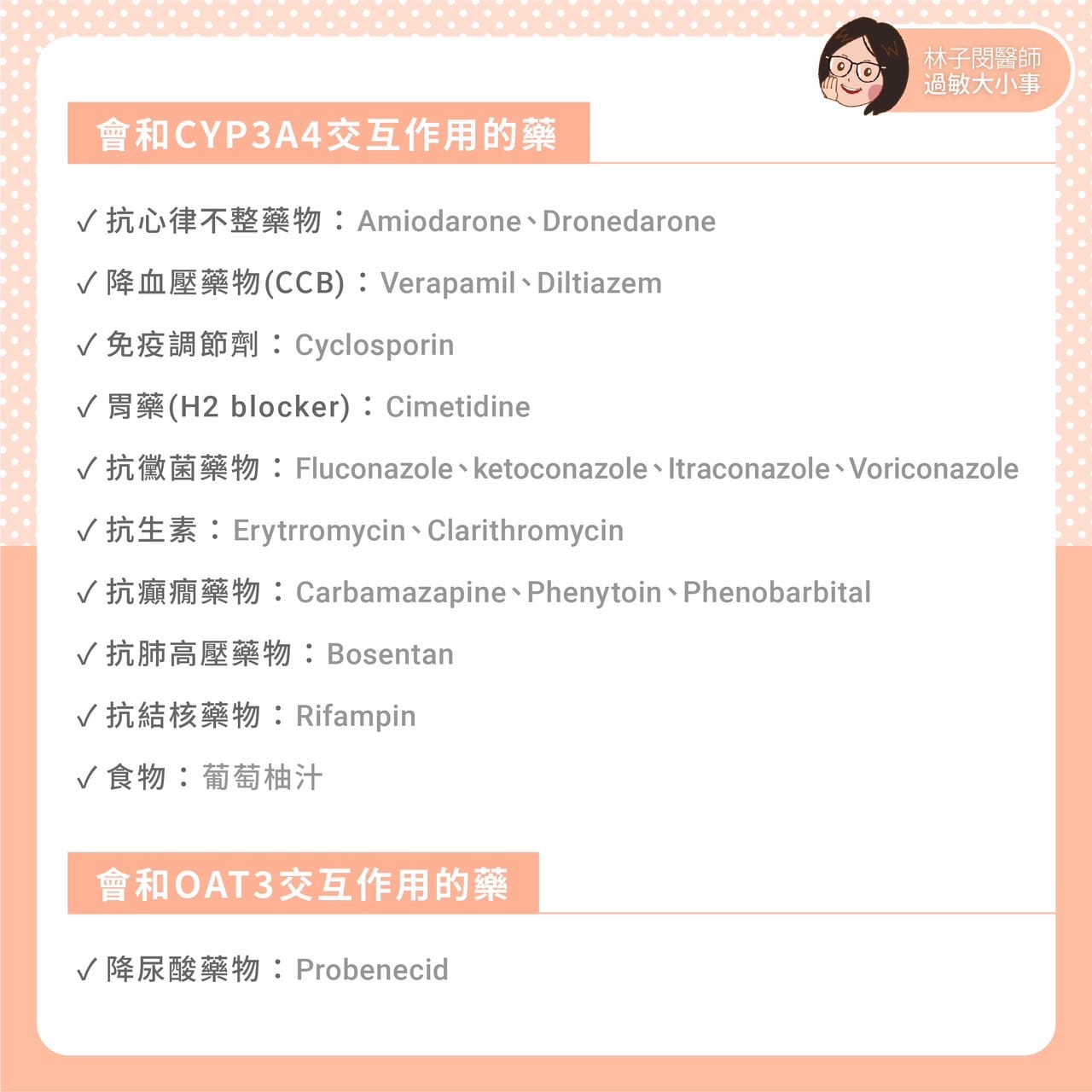 除了三種抑制劑之間的適應症不太一樣以外,由於都是口服藥物,藥物經由不同方式(CYP3A4和OAT3都是酵素)代謝,因此要特別注意與其他藥物交互作用的問題。
