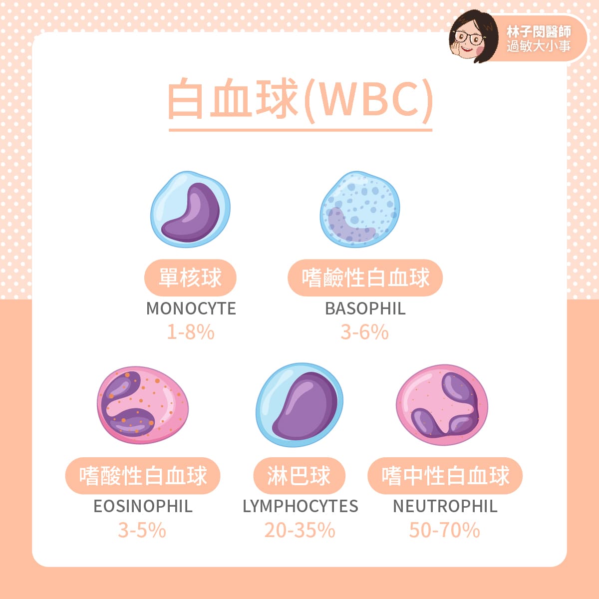 其實白血球(WBC)中,可以再進一步細分為嗜中性白血球(50-70%),淋巴球(20-35%),單核球(1-8%),嗜酸性白血球(3-5%),嗜鹼性白血球(3-6%)。各種不同的血球都有不同的功能,例如嗜中性白血球常常會因爲感染而增加,淋巴球會因爲免疫系統不全而減少。