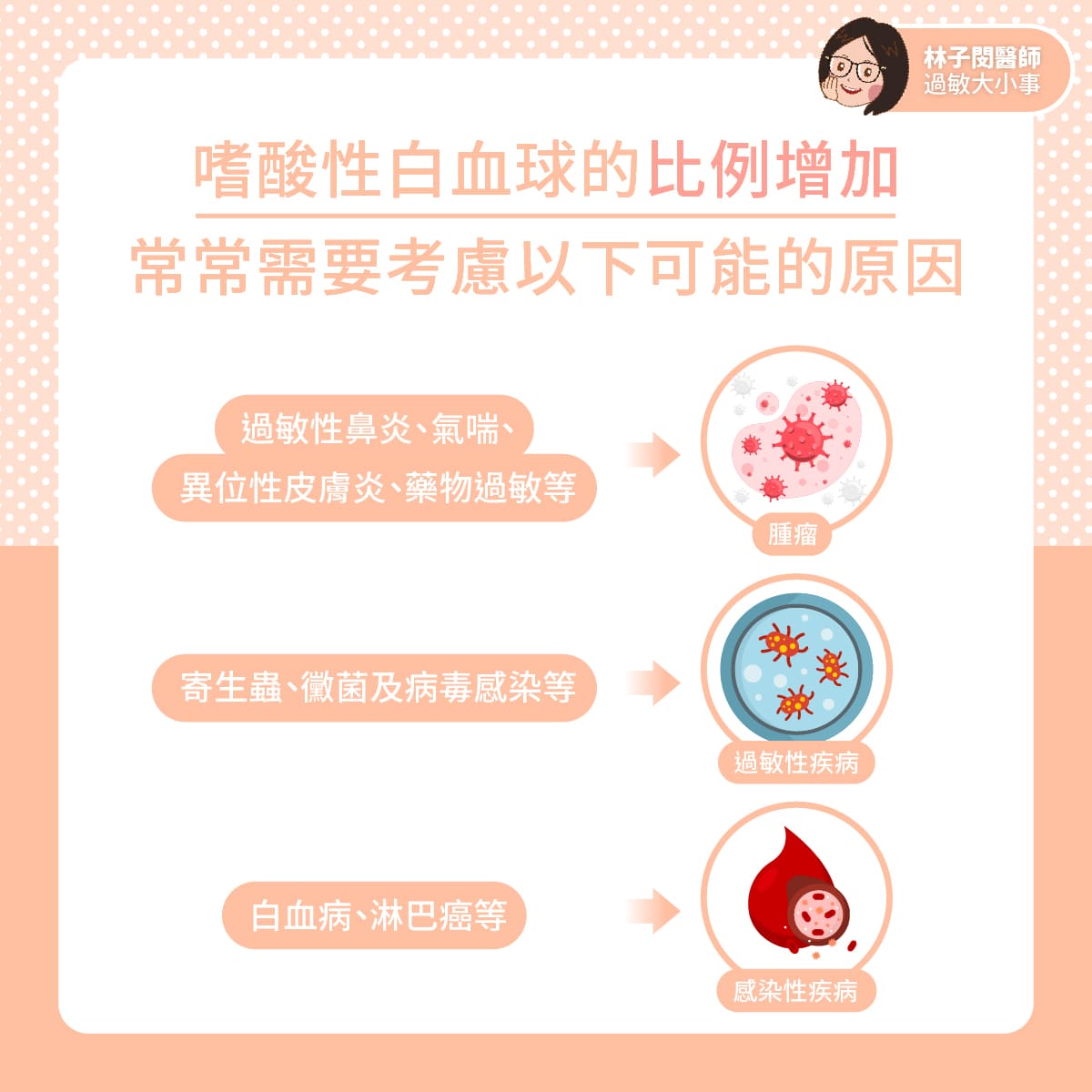 而嗜酸性白血球的比例增加,常常需要考慮以下可能的原因: