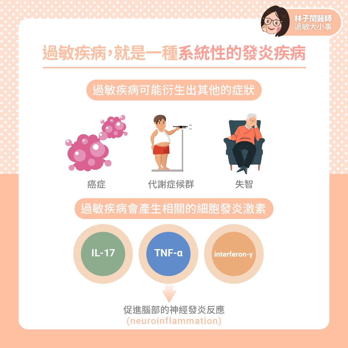 過敏疾病,就是一種系統性的發炎疾病。在致病機轉中牽涉到許多發炎激素。因此許多研究都關注在過敏疾病可能衍生出其他的問題,例如是否會增加癌症,代謝症候群和失智的風險。在動物實驗模型中已經證實,過敏疾病會產生相關的細胞發炎激素,例如IL-17,TNF-α,inteferon-γ,促進腦部的神經發炎(neuroinflammation)反應。有一個動物實驗,有氣喘體質的小鼠暴露在過敏原中時,會激發腦部細胞中的微膠細胞(microglia)產生相關細胞發炎激素。
