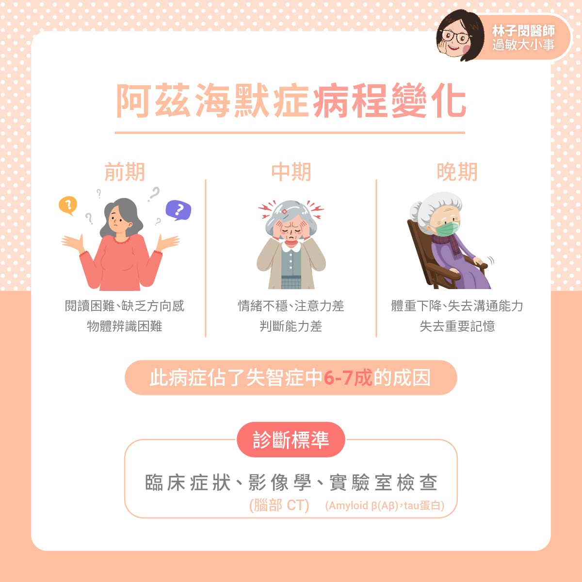 阿茲海默症默症是一種發病進程緩慢、隨著時間不斷惡化的神經退化性疾病,此病症佔了失智症中六到七成的成因。症狀一開始常常是發現輕微的認知困難,或是注意力與學習障礙,隨著病情惡化,病患將失去獨立生活的能力。診斷標準通常是根據患者的臨床症狀、影像學(腦部 CT)和實驗室檢查(Amyloid β(Aβ),tau蛋白)等因素來確定。
