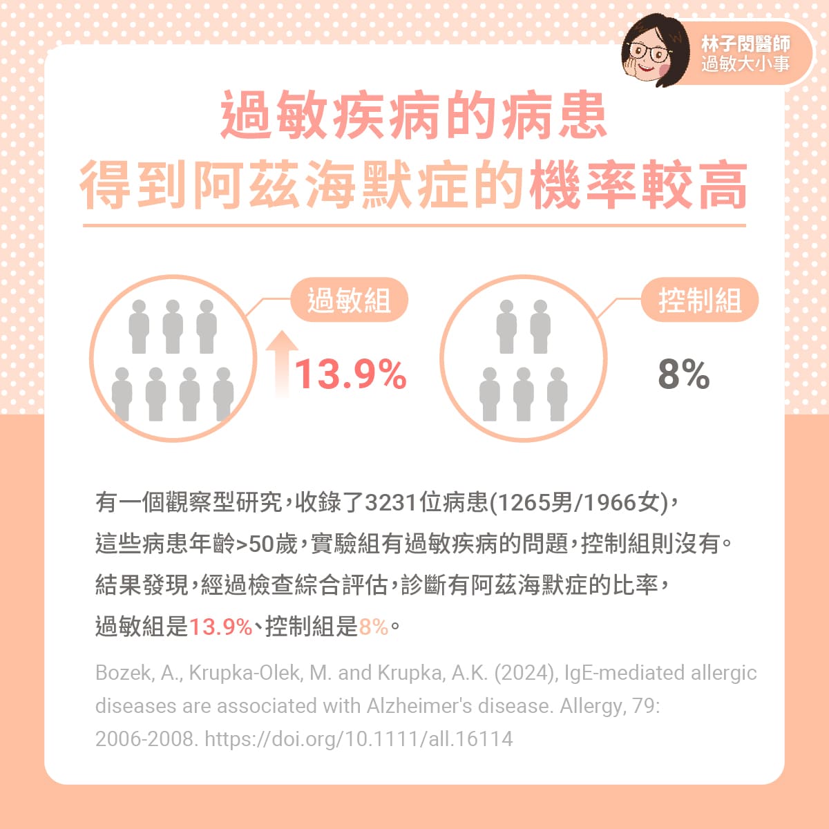 有一個觀察型研究,收錄了3231位病患(1265男/1966女),這些病患年齡>50歲,實驗組有過敏疾病的問題,控制組則沒有。結果發現,經過檢查綜合評估,診斷有阿茲海默症的比率,
