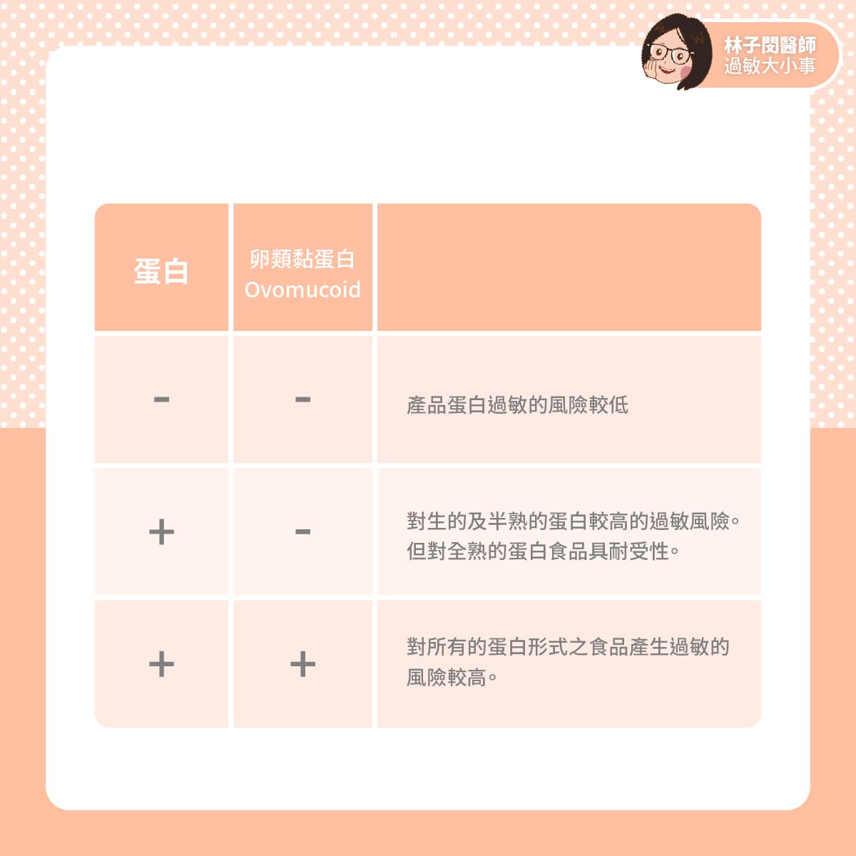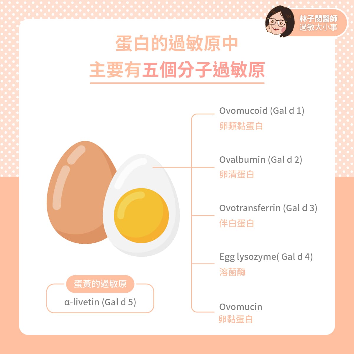 Ovomucoid (Gad 1),又稱為「卵類黏蛋白」,是最主要的雞蛋分子過敏原。「卵類黏蛋白」對熱及化學降解有很高的抵抗力。因此烹調方式並不會影響它的結構及致敏性。換言之,如果今天檢測的結果是同時對蛋白及Ovomucoid都有IgE致敏,那麼對所有的蛋白型式的食品產生的過敏風險都很高。也就是說對半熟的荷包蛋,全熟的阿婆鐵蛋都會過敏。