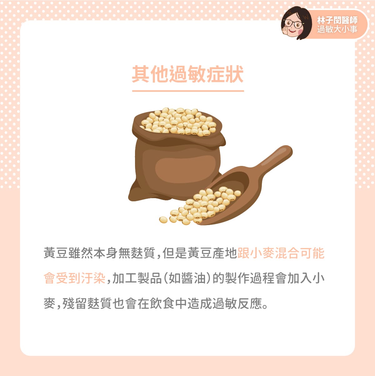 亞洲人的麩質過敏比例不高,但是在門診也遇過幾位麩質過敏的病人,以及運動誘發麩質過敏(WDEIA)的病患。有這樣子症狀的朋友,在選擇飲食的時候,對小麥和醬油製品都要特別注意。