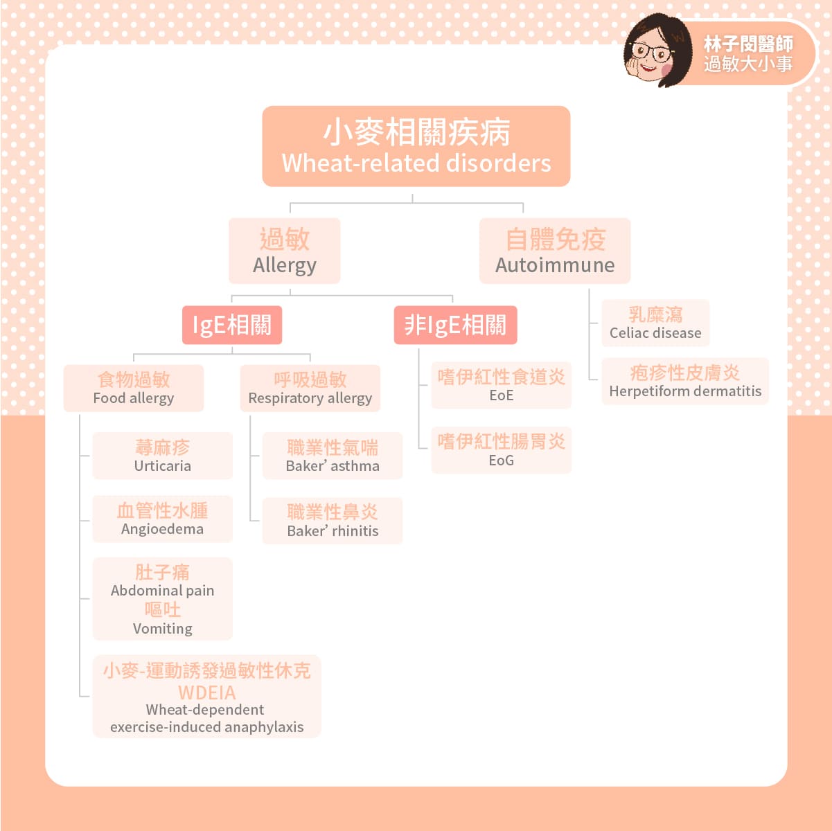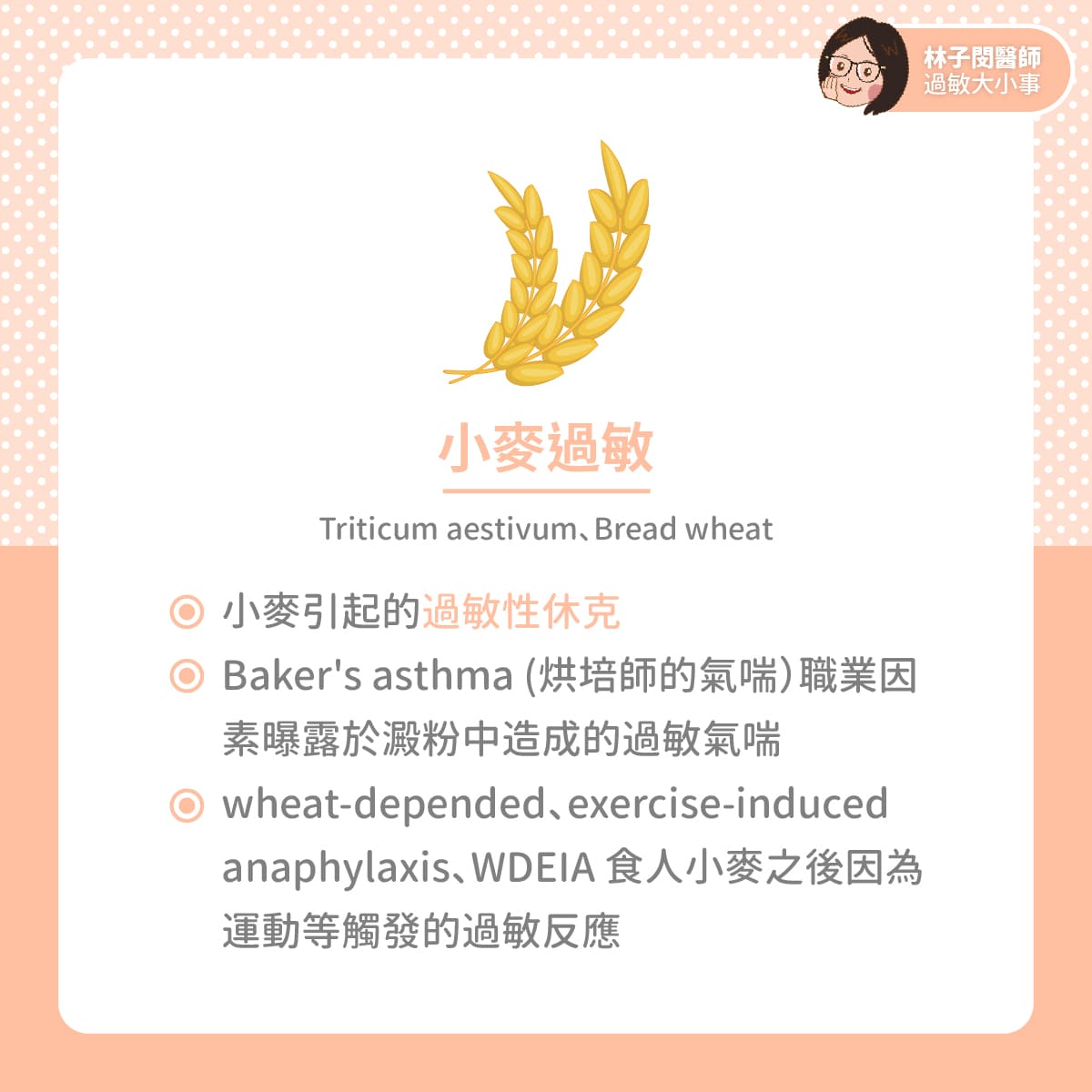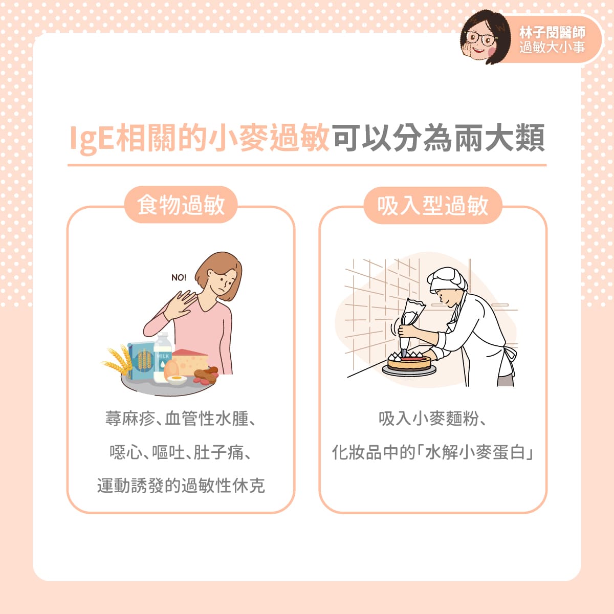 IgE相關的小麥過敏可以分為 #食物過敏 和 #吸入型過敏 兩大類。 典型的小麥類食物過敏主要是蕁麻疹,血管性水腫(香腸嘴,金魚眼,呼吸道水腫),噁心,嘔吐,肚子痛,還有一類很特別的「運動誘發的過敏性休克」(exercise-induced anaphylaxis, EIA),又稱為「小麥-運動誘發的過敏性休克」(wheat-dependent,exercised induced anaphylaxis, WDEIA)。根據統計,在小麥過敏的孩童中,超過50%的人有WDEIA,這是一種很特別的過敏性休克,主要和攝入小麥食物後1~3小時(有時甚至長達6小時),運動誘發了過敏性休克。