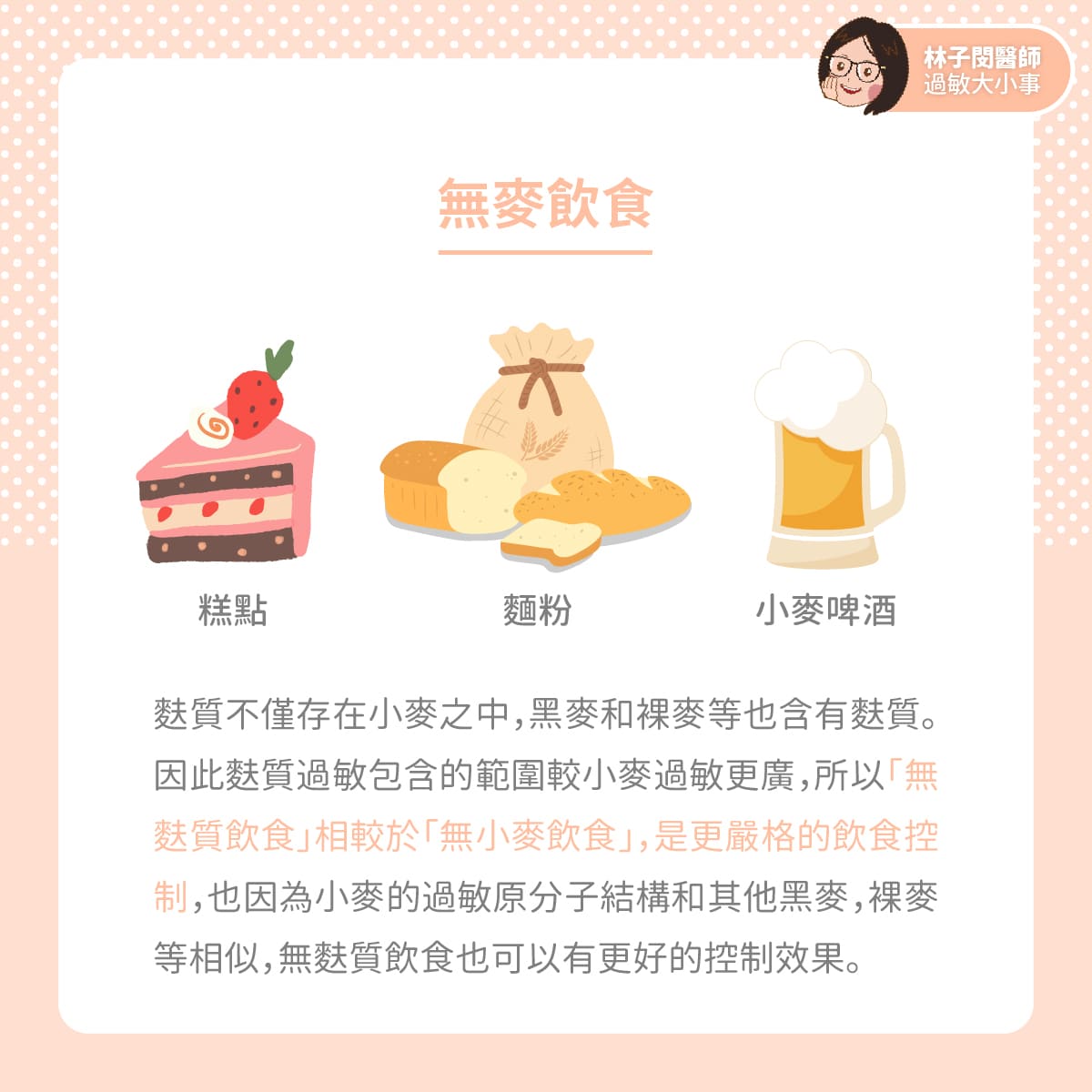 麩質不僅存在小麥之中,黑麥和裸麥等也含有麩質。因此麩質過敏包含的範圍較小麥過敏更廣,所以「無麩質飲食」相較於「無小麥飲食」,是更嚴格的飲食控制,也因為小麥的過敏原分子結構和其他黑麥,裸麥等相似,無麩質飲食也可以有更好的控制效果。執行無麩質飲食時,要注意一些潛藏麩質而未注意的食物,例如: