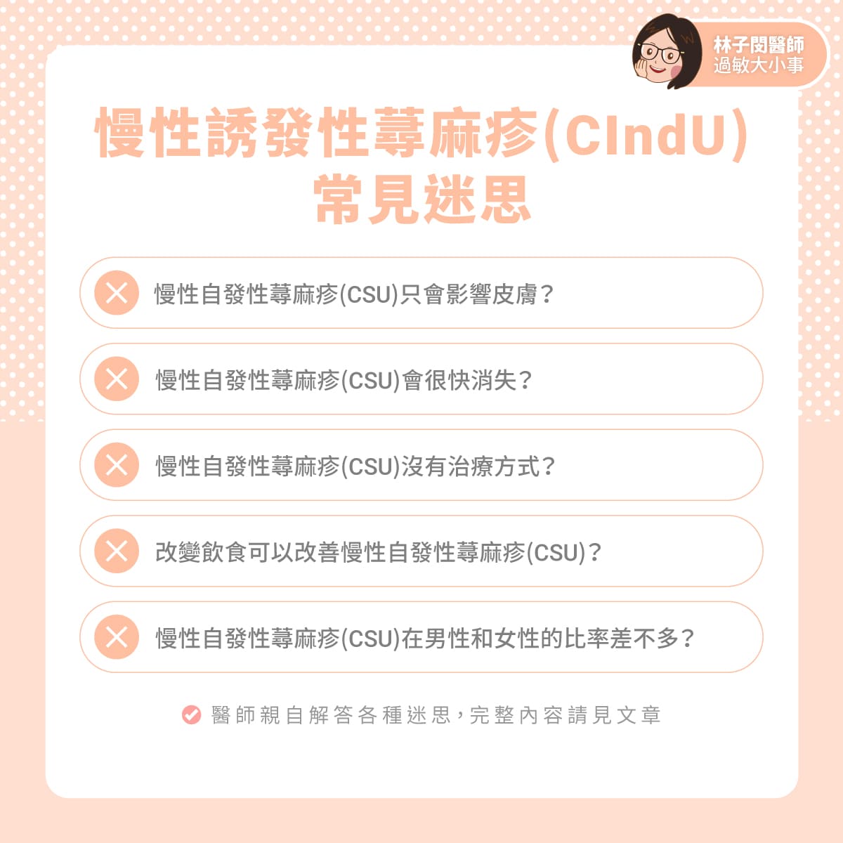 暨上篇談到慢性蕁麻疹,我們這篇就慢性自發性蕁麻疹的幾項常見問題(迷思)開始講解吧~
